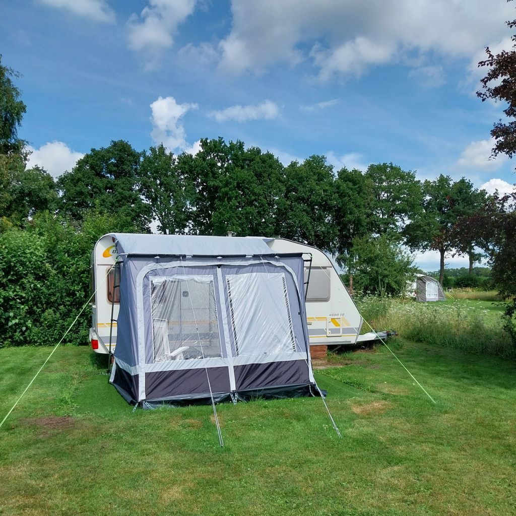 De caravan met voortent (staat op plaats 12) is geschikt voor maximaal twee volwassenen. Aan de ene kant van de caravan bevindt zich een rondzit. Aan de andere kant een vast twee-persoonsbed met matras op lattenbodem. De kant van het bed kan worden afgesloten met een schuifwand. Verder heeft de caravan een compleet keukentje, een wc en heel veel opbergruimte. Er staan vier tuinstoelen en een tafel. Er is een complete inventaris met o.a. koffiezetapparaat, waterkoker, pannen, borden, bestek en kopjes en glazen. De inventarislijst is op aanvraag beschikbaar. Beddengoed (incl. dekbedden en kussens), handdoeken enz. moet u zelf meenemen i.v.m. de hygiëne en de kosten. Wel liggen er in de caravan theedoeken en keukendoeken. Indien u het toilet in de caravan gebruikt moet u de container voor uw vertrek zelf legen en schoonmaken.